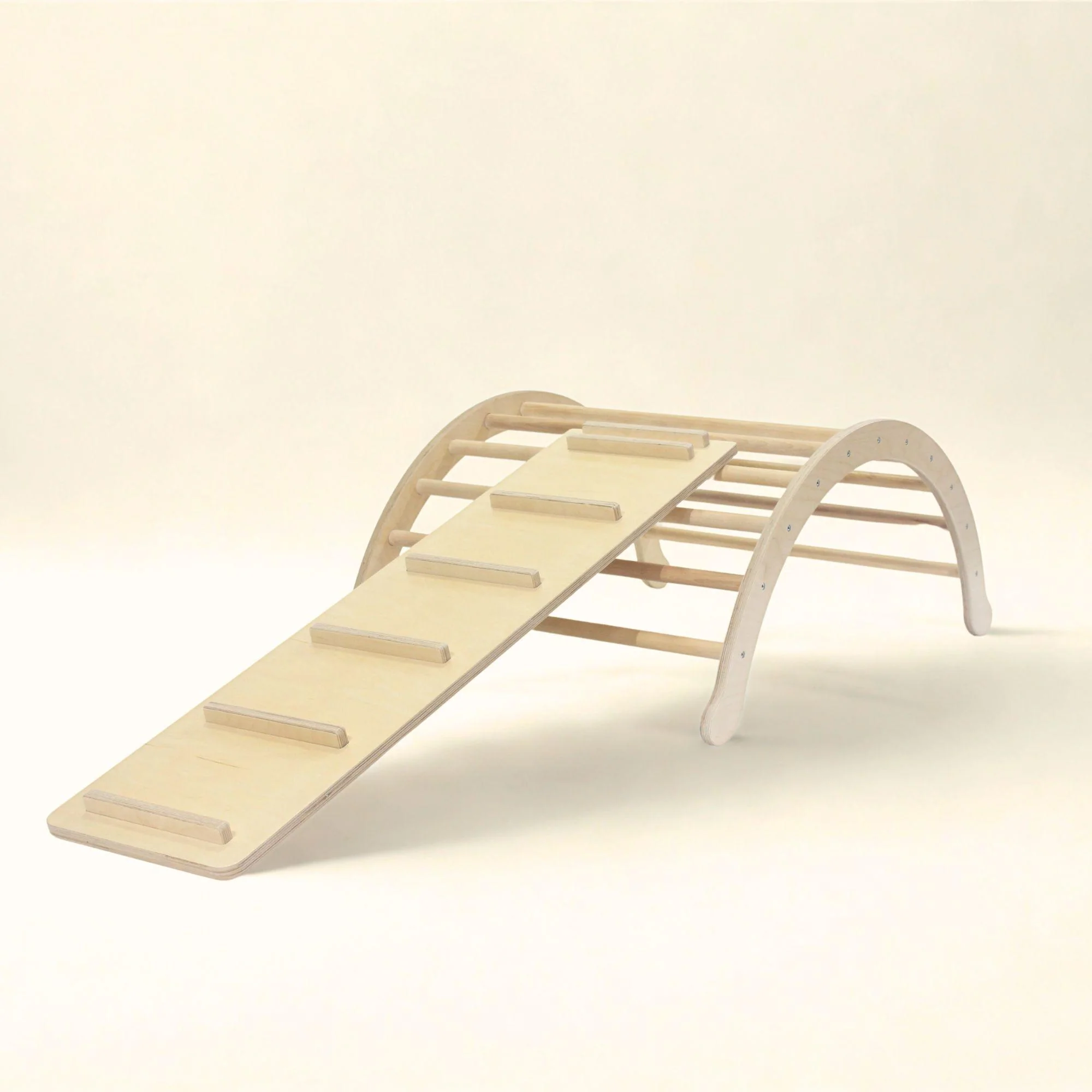 Unlike a traditional Pikler Triangle, the rounded arch design places children in a more prone climbing position. This naturally encourages greater use of the arms, shoulders, core, and grip strength as children pull, push, and stabilize their bodies while climbing. The curved shape invites crawling over, hanging, traversing, and controlled climbing, supporting upper body strength and body awareness in a way that complements, rather than duplicates, triangle style climbing.